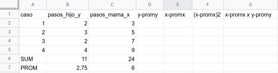 agregamos en la columna D y-promy, que es el caso correspondiente de \(Y\) (pasos hijo) menos su promedio. Por ejemplo, el primer caso de \(Y\) tiene el valor 2, y su promedio es 2,75. Por lo tanto, 2-2,75=-0.75, que es el valor a anotar en la celda correspondiente (columna D de la fila del caso 1).
